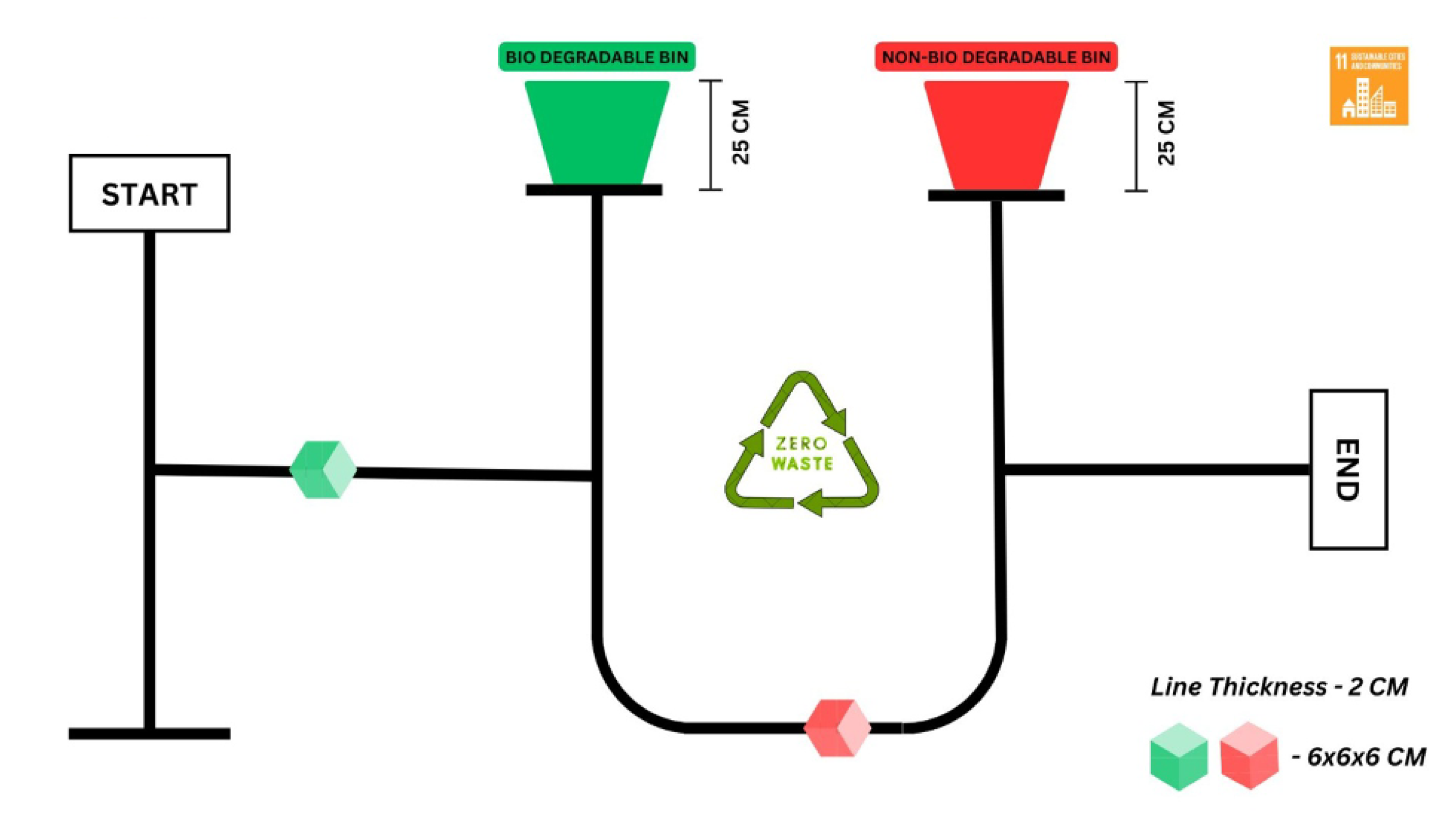 In this category, students need to build a fully automatic robot that follows a line path, picks up/drags degradable and non-degradable blocks (which are represented in two colors – Green and Red respectively) and places them in the designated bins. No Wired/Wireless remote controlled robot is allowed in this category. The maze will be designed with the black line on a white surface. The line thickness will be 2 Cm. The robot must be calibrated in such a way it follows the black line properly and also push/grab the color block in between the movement. The blocks will be placed on the line itself. The robot should start from the starting zone and reach the end point after completing both the sorting tasks.