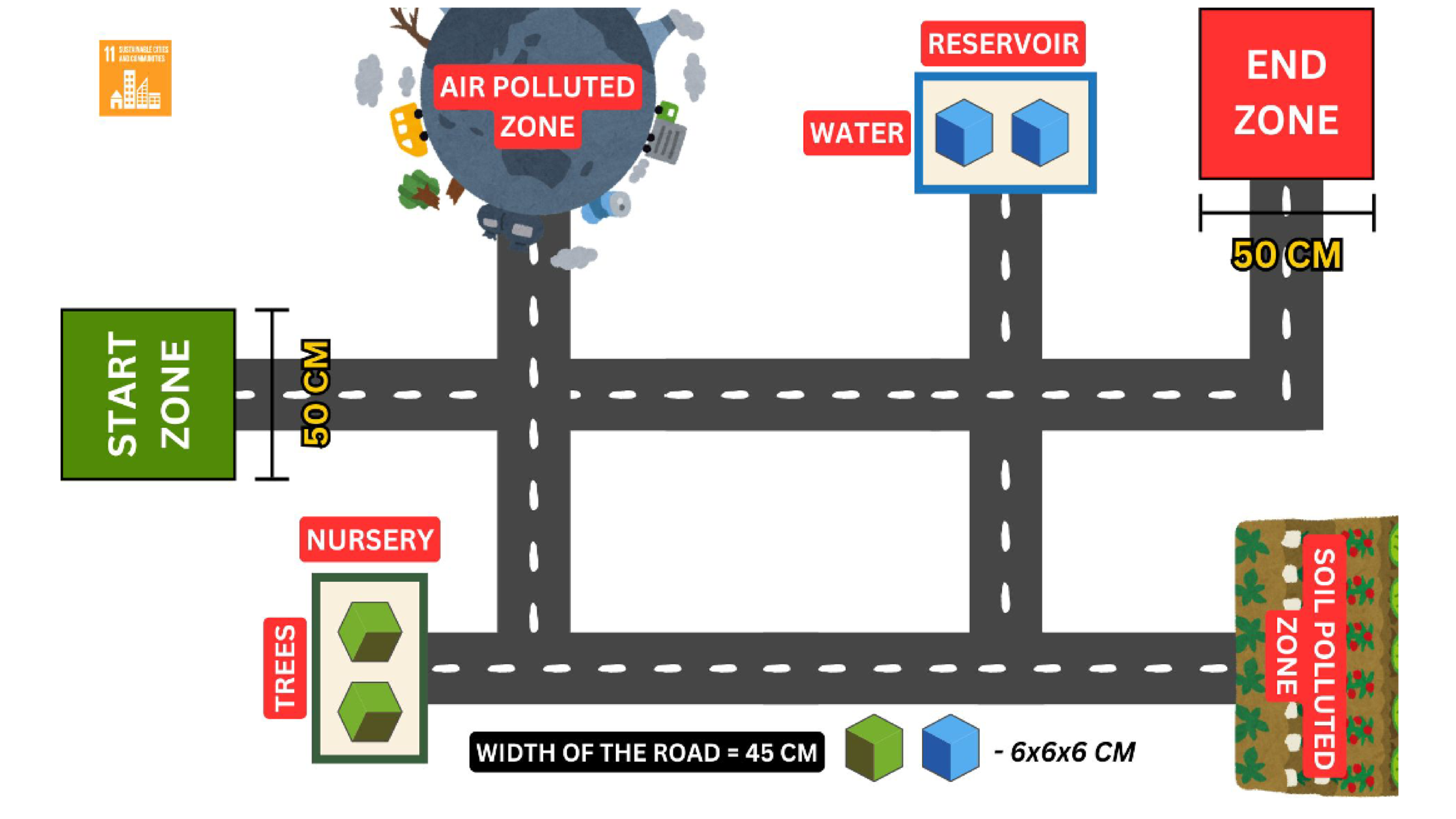 Zero Pollution Car Maze is an eco-themed robotics challenge where students navigate a miniature electric or renewable-energy-powered car through a specially designed maze that represents real-world environmental zones affected by pollution. The task tests precision, path-planning, and problem-solving as the car must avoid “polluted” areas, take the cleanest possible route, and reach the final destination with zero emissions. The arena encourages awareness of sustainable mobility by rewarding energy efficiency, accurate turns, and smooth navigation, making it both a fun and educational event promoting green technology.